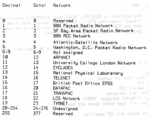 Ce protocole avait une particularité intéressante, il contenait quatre champs adresse dans son header, contre deux pour IPv6. Un pour le réseau de destination (et d'origine), rappelez vous, nous sommes en 1974 et à cette époque le réseau Internet comme nous le connaissons aujourd'hui n'existe pas, il existe donc différents réseaux concurrent, ce champ dans l'en-tête a pour but de spécifier sur quel réseau le paquet doit transiter. Ainsi, vous pouvez voir ci-dessous les différentes valeurs possibles pour ce champ et donc les principaux réseaux qui cohabitent à cette époque.