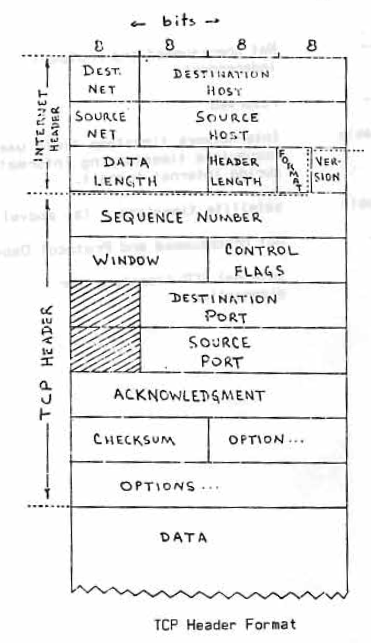 Autre différence, les "host identifier", anciennement appelés adresses TCP, sont maintenant codés sur 24 bits, soit un total de 16 777 216 adresses. On peut aussi voir le début de la séparation entre TCP et IP dans ce schéma d'époque avec les parties "TCP Header" et "Internet Header".